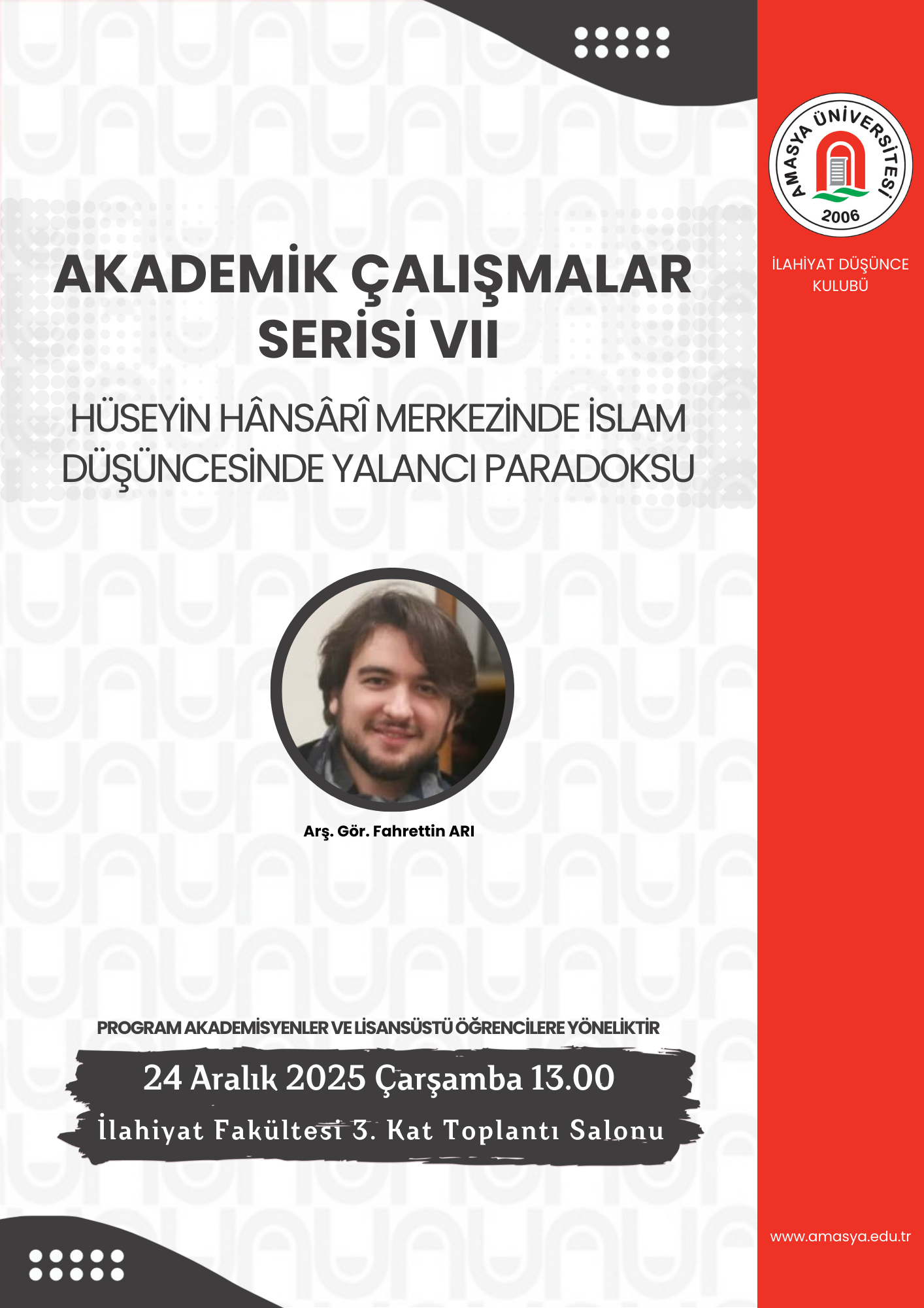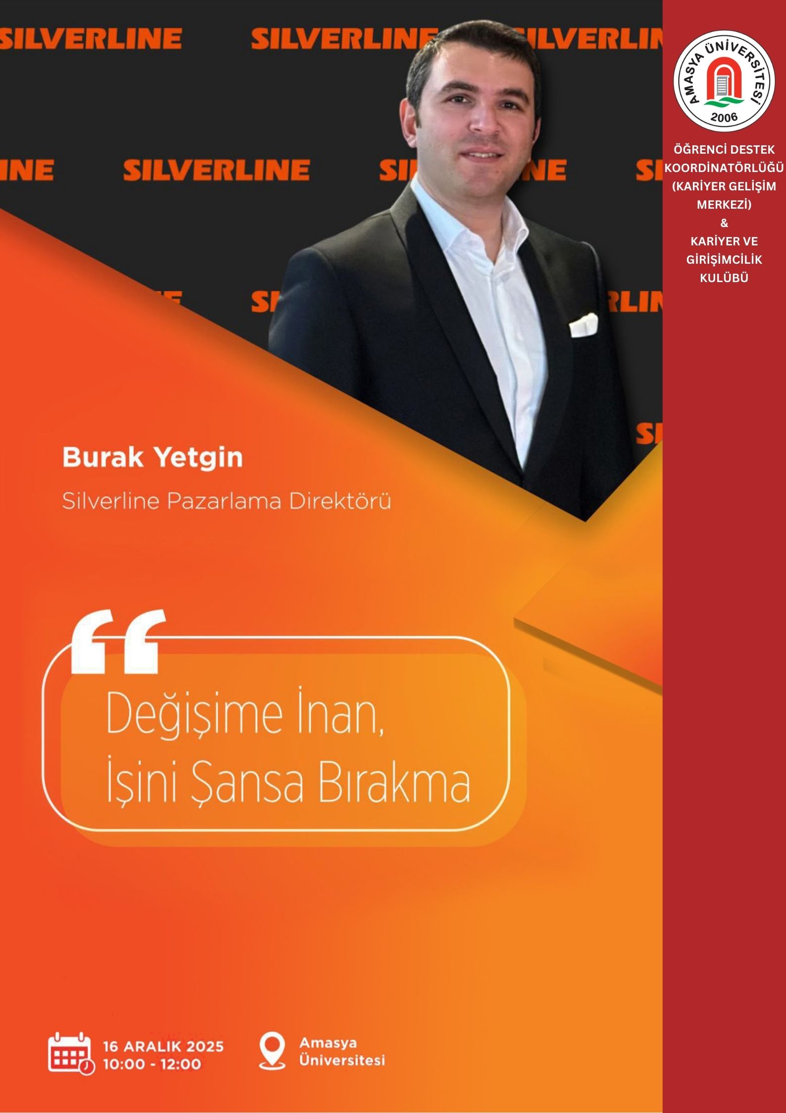 Amasya Üniversitesi Öğrenci Destek Koordinatörlüğü Kariyer Gelişim Merkezi ve Kariyer ve Girişimcilik Kulübü iş birliğinde, Silverline Pazarlama Direktörü Burak Yetgin’in katılımıyla “Değişime İnan, İşini Şansa Bırakma” konulu kariyer konferansı gerçekleştirildi. Milli Hakimiyet Yerleşkesi Kongre ve Kültür Merkezi’nde düzenlenen konferansa; Rektör Yardımcıları Prof. Dr. Murat Kurt ve Prof. Dr. Resul Çekin’in yanı sıra akademik ve idari personel ile çok sayıda öğrenci katıldı. Konferansta konuşan Burak Yetgin, iş dünyasında değişime uyum sağlama, etkili kariyer planlaması ve pazarlama alanındaki mesleki deneyimlerine…