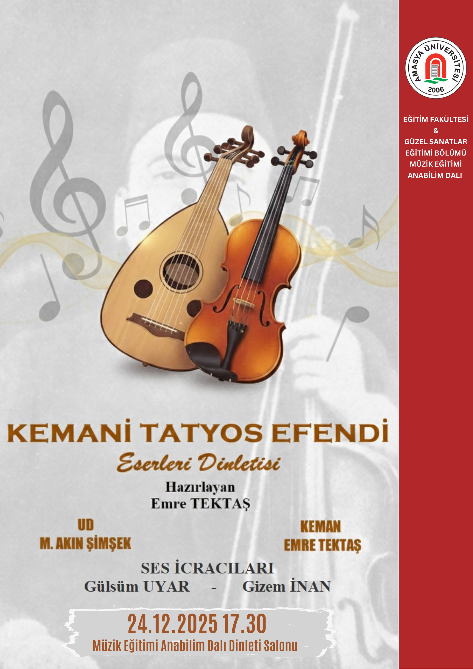 Amasya Üniversitesi İmaret Bilim Kültür ve Sanat Merkezinde çarşamba akşamları düzenli olarak gerçekleştirilen “Dini Musiki İmaret Meşkleri” programı, Hattat Hamdullah Güzel Sanatlar Fakültesi Dekan Yardımcısı Doç. Dr. Tahir Çağman’ın riyasetinde yoğun ilgiyle sürdürülüyor. Son haftalarda gerçekleştirilen İmaret Meşkleri 30, 31 ve 32 programlarında; Beyâti, Karcığar ve Uşşâk makamlarında icra edilen yeni eserler dinleyicilerden büyük beğeni topladı. Enstrüman icracılarının aktif katılımıyla zenginleşen meşk ortamı hem akademisyenlerden hem de şehir halkından geniş bir katılım aldı. Geleneksel dini musikinin yaşatılması ve…